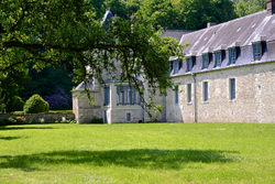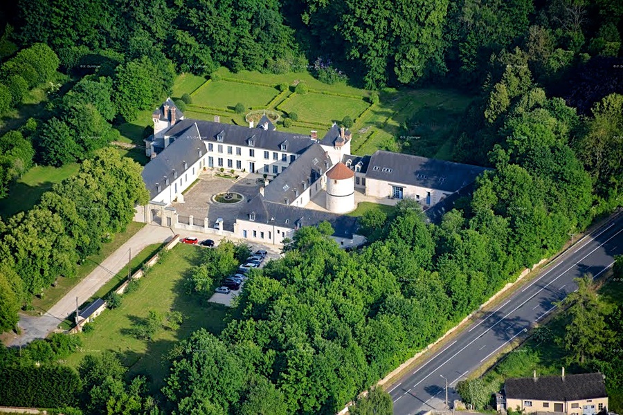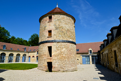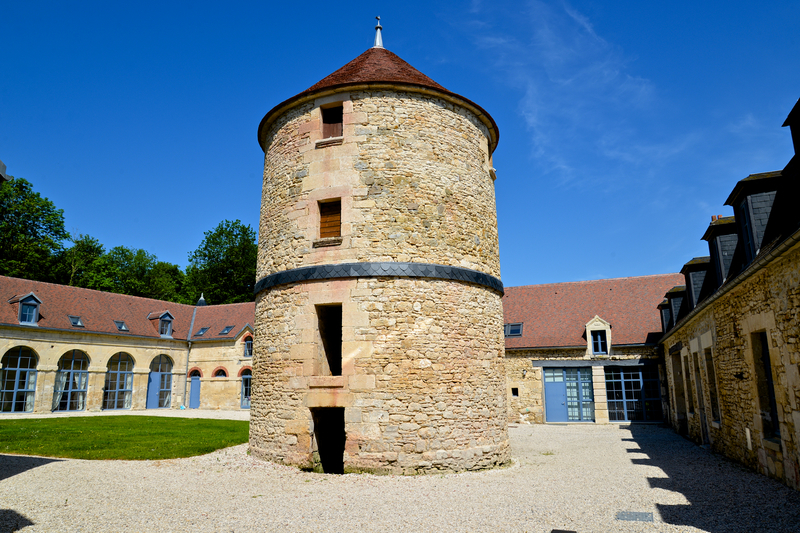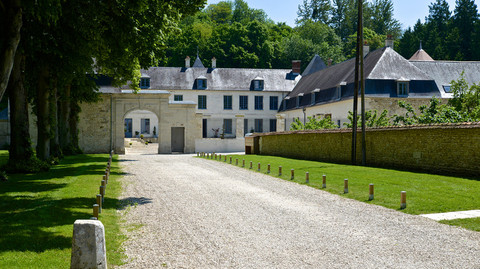 - Autour d'une cour d'honneur, le logis des Seigneurs avec une fontaine et vue sur le parc.